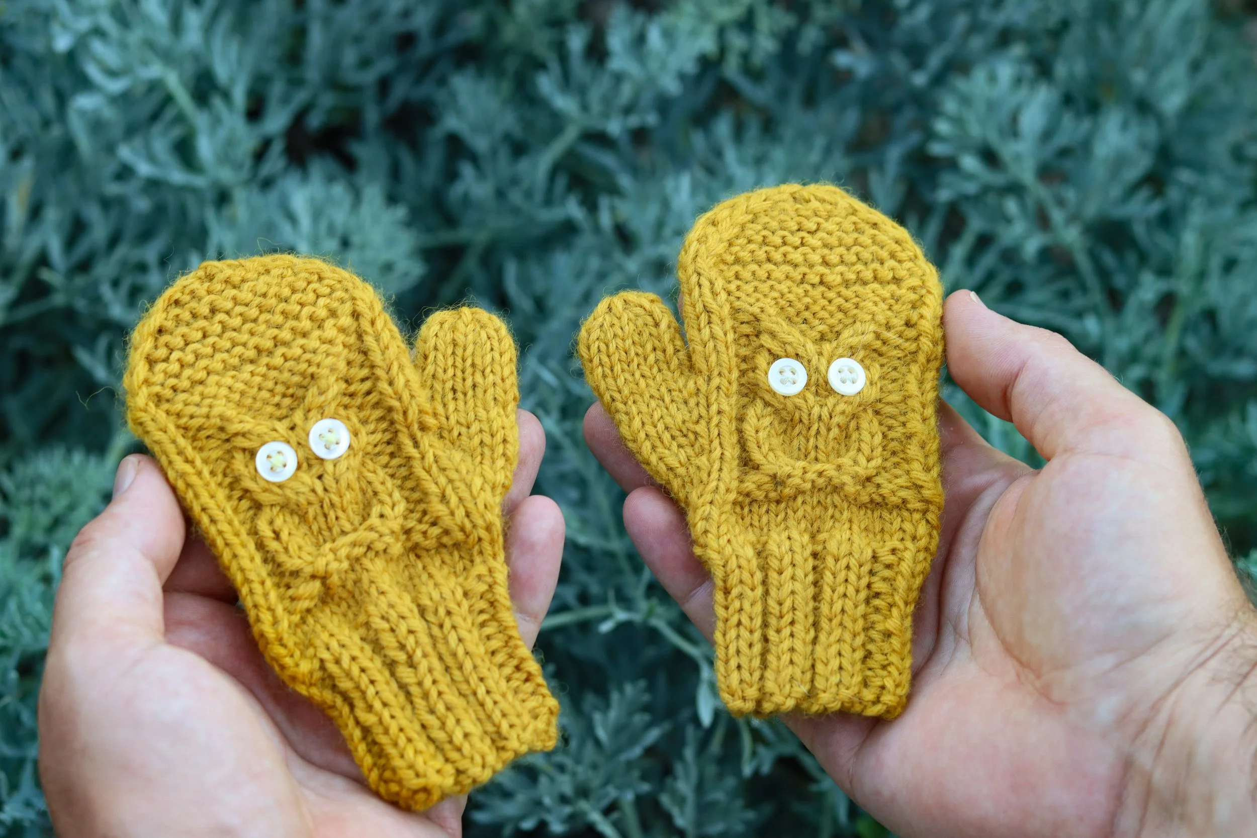 Above: Safflower-dyed wool, knit into little baby mittens for a special little friend 💛🦉💛