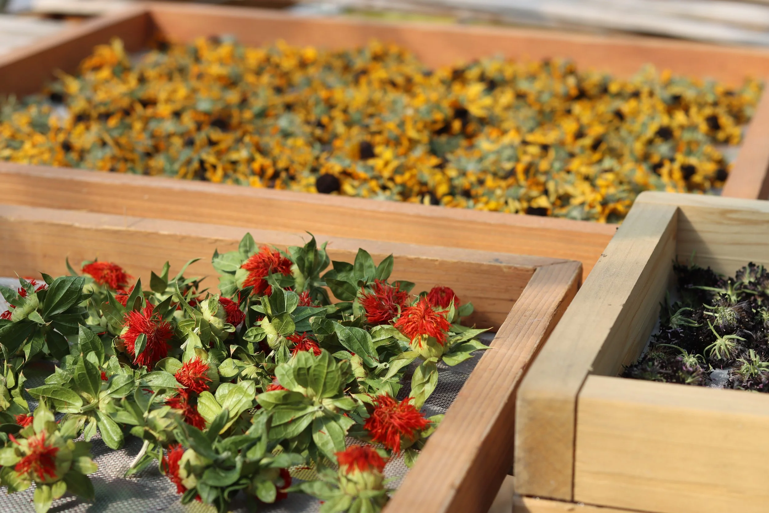 Above: Whole flower heads drying on a summer afternoon. These flower heads were harvested early as we noticed rain in the forecast, and didn’t have time to hand harvest all of the petals. We quickly cut off the heads to process at a later date.